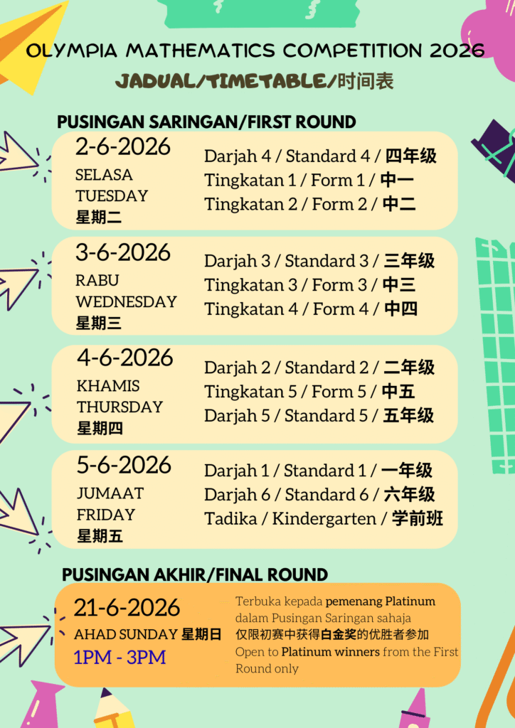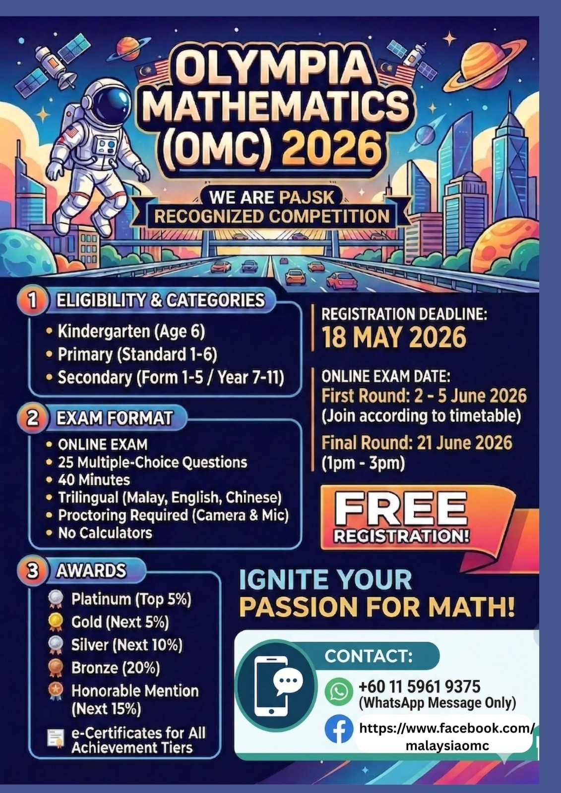 The Olympia Mathematics Competition (OMC) is a prestigious international math competition open to students from Malaysia and abroad. It aims to ignite students’ interest in mathematics and enhance their logical thinking and problem-solving skills. Since its inception, OMC has consistently been one of Malaysia’s most influential math competitions.